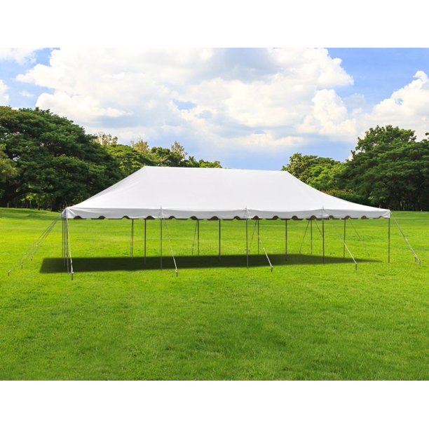 This tent is one of our most cost effective choice for informal outdoor gatherings providing space for up to 80 guests! It's light duty vinyl lets the perfect amount of sunlight in while still keeping the area underneath cool and dry for your guests. Pole tents are the perfect choice for set up on grass, dirt, gravel or even pavement (drilling is required for pavement). Please keep in mind that pole tents like this one cannot be anchored down with cement blocks so if staking is not possible in the area where you'd like the tent to be installed then please check out our high peak frame tent in this size.