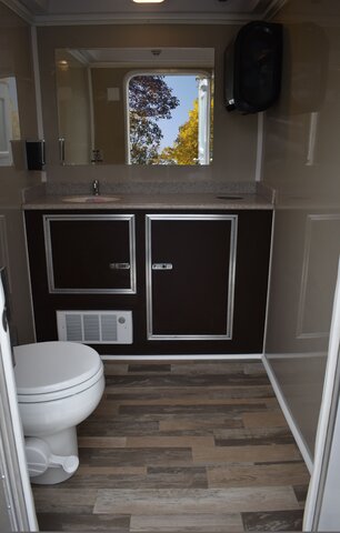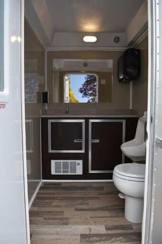 An luxurious solution to the restroom needs of all outdoor events and an absolute MUST for weddings! Provides your guests with a comfortable, secure and refined space for all their personal needs. If you've ever used one of these it's almost impossible to go back to your standard port-o-potty, you'll never look back! Features: 2 beautiful rooms, one dedicated just for women and the other dedicated for men. Hands free, porcelain commode in both rooms. Self-flushing, porcelain urinal in the men's room. Solid surface counter tops with stainless steel sinks. Vanity mirrors in both rooms. Soap dispensers, toilet tissue holders, paper towel dispensers. Vacant / Occupied lights for each restroom. Entrance / Exit platforms with full handrails. Amber LED porch lights located on the exterior. Stabilizing jacks to keep trailer firmly planted in place. What's Included: All environmental and associated waste dumping fees. All paper products: toilet paper, paper towels, tissues. What's Needed: Nearby power supply (within 100 feet, requires only a normal outlet). Generator Rental available for locations without power! Access to water to fill tanks (does not require a hose to be connected).